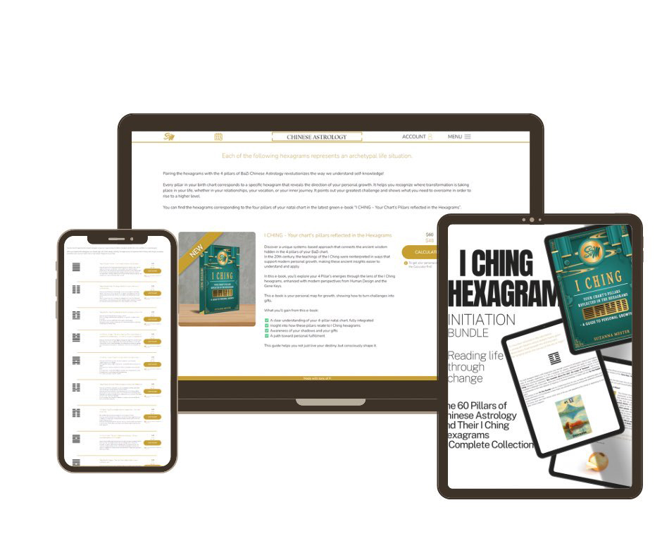 All Chinese astrological pillar combinations can be associated with 60 hexagrams, which are more prominent in our birth chart, but in time transit, we are almost certain to experience each and every one of their qualities. There are some that are our greatest tasks in our present life, and there are some that we only get to experience for a year (repeating in 60-year cycles) or even a month.